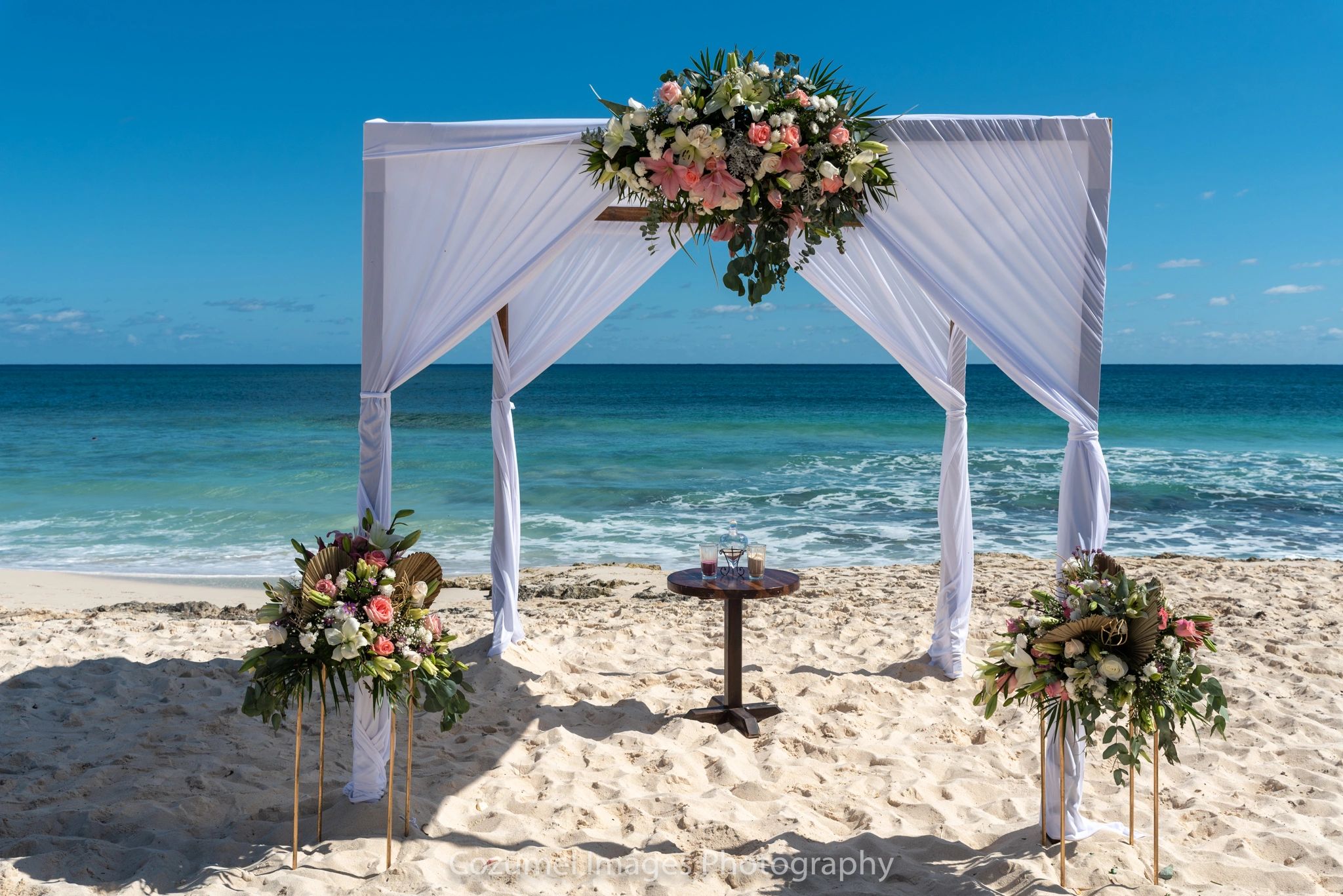 Floral Arch: Semi-circle structure filled with natural standard flowers, foliage and filling flowers perfect to set up either on the sand or on the grass, color scheme can be chosen. Customized flowers can be priced differently.
